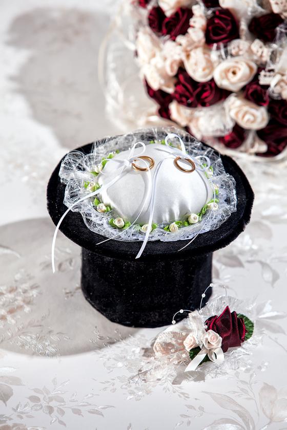 Tagliare la calza a misura, imbottirla con un po' di ovatta e incollarvi sopra la seta. Arrotolare il nastro di pizzo intorno alla seta e fissare il tutto con spille per fiori di paglia. Incollare il "cuscino" di seta nel cilindro. Incollare le perle di cera di vetro alle estremità dei fili di supporto, accorciare i fili a 5 cm, incollare una rosa di raso su ciascuno di essi e inserire i fili nello spazio tra di essi. Cucire a mano due nastri di raso sul cuscino e utilizzarli per fissare gli anelli.