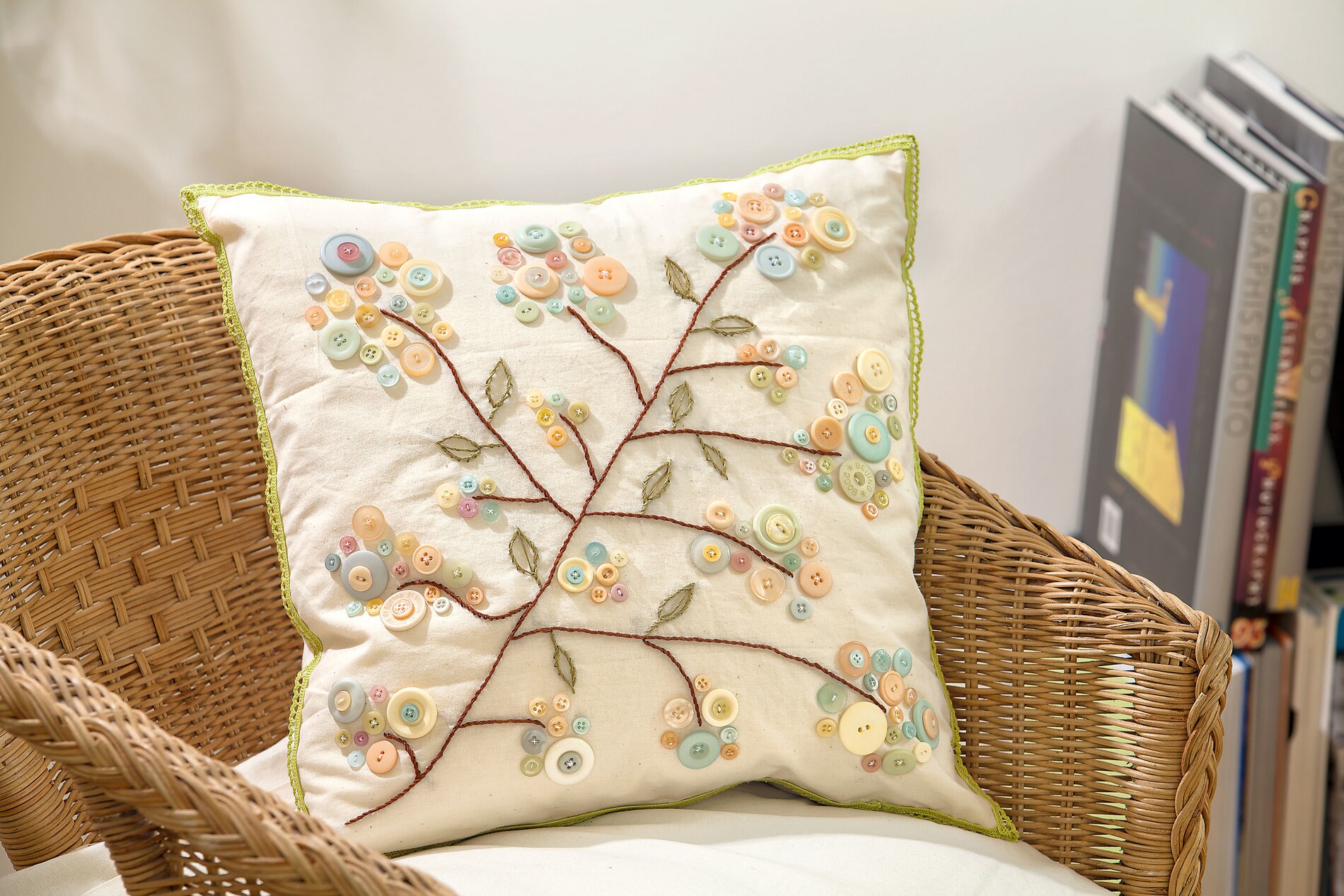 Delineate un ramo sulla fodera del cuscino con un pennarello e provate a montare i bottoni. Quindi ricamare le linee delineate con il filo da ricamo marrone a punto stem.
