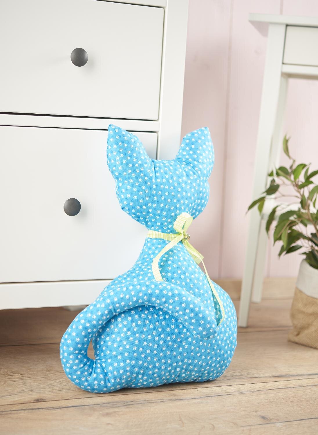 Stendere la stoffa del motivo nel senso della lunghezza davanti a voi, accostarla (il motivo stampato è all'interno) e trasferire le due parti del motivo del gatto, una con la coda e una speculare al centro del gatto senza coda, sulla stoffa doppiata. È utile appuntare i tessuti e il motivo in precedenza. A questo punto è possibile ritagliare i due pezzi di stoffa del gatto con un margine di cucitura di circa 1 cm.