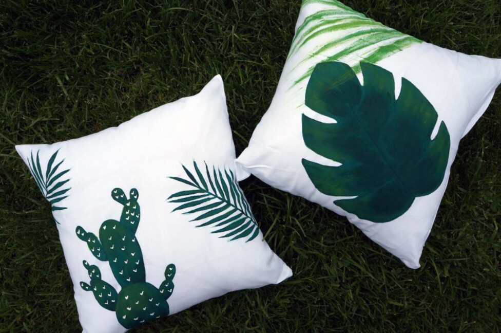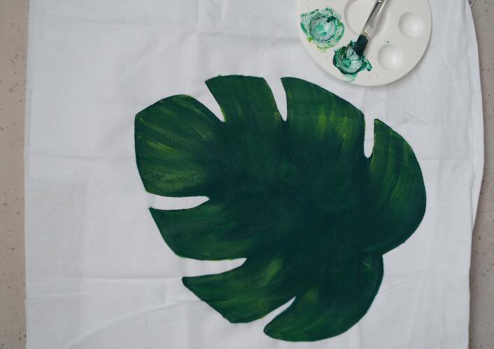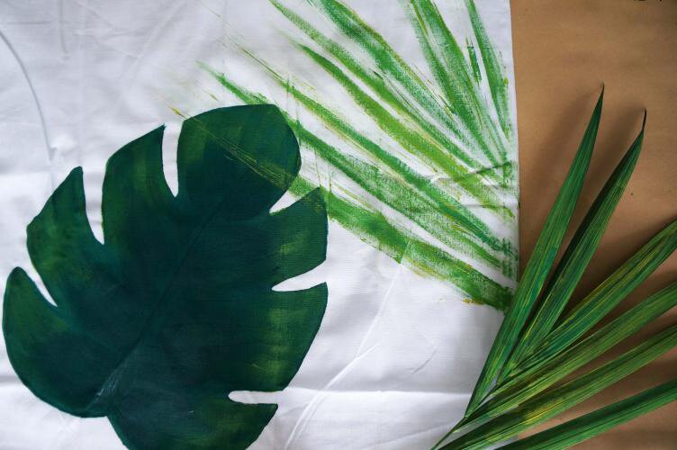 Come timbri per il disegno si possono usare anche foglie vere o fronde di palma. In questa idea, una foglia di palma è stata rivestita di colore per un cuscino e "timbrata" sulla copertina.