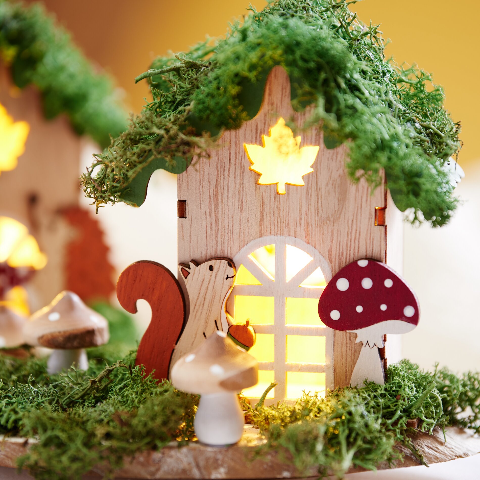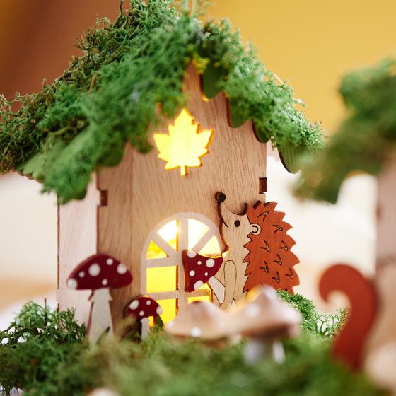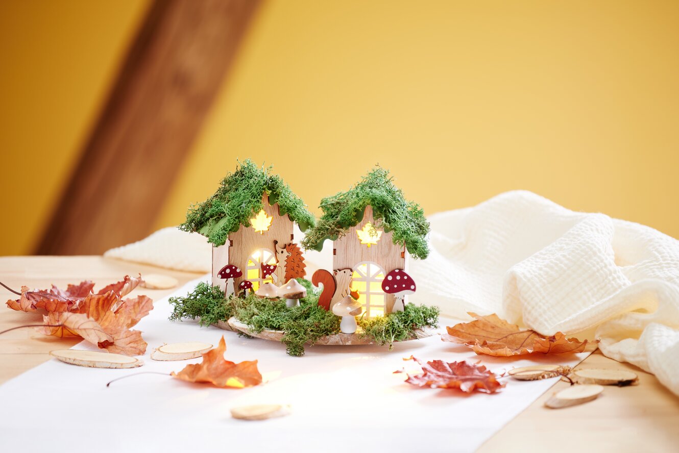 Ora potete decorare la composizione autunnale. Incollate muschio e funghi intorno alle casette. Questo creerà un paesaggio autunnale idilliaco. Distribuite le decorazioni in modo da creare un quadro d'insieme equilibrato e da mostrare tutti gli elementi al meglio.