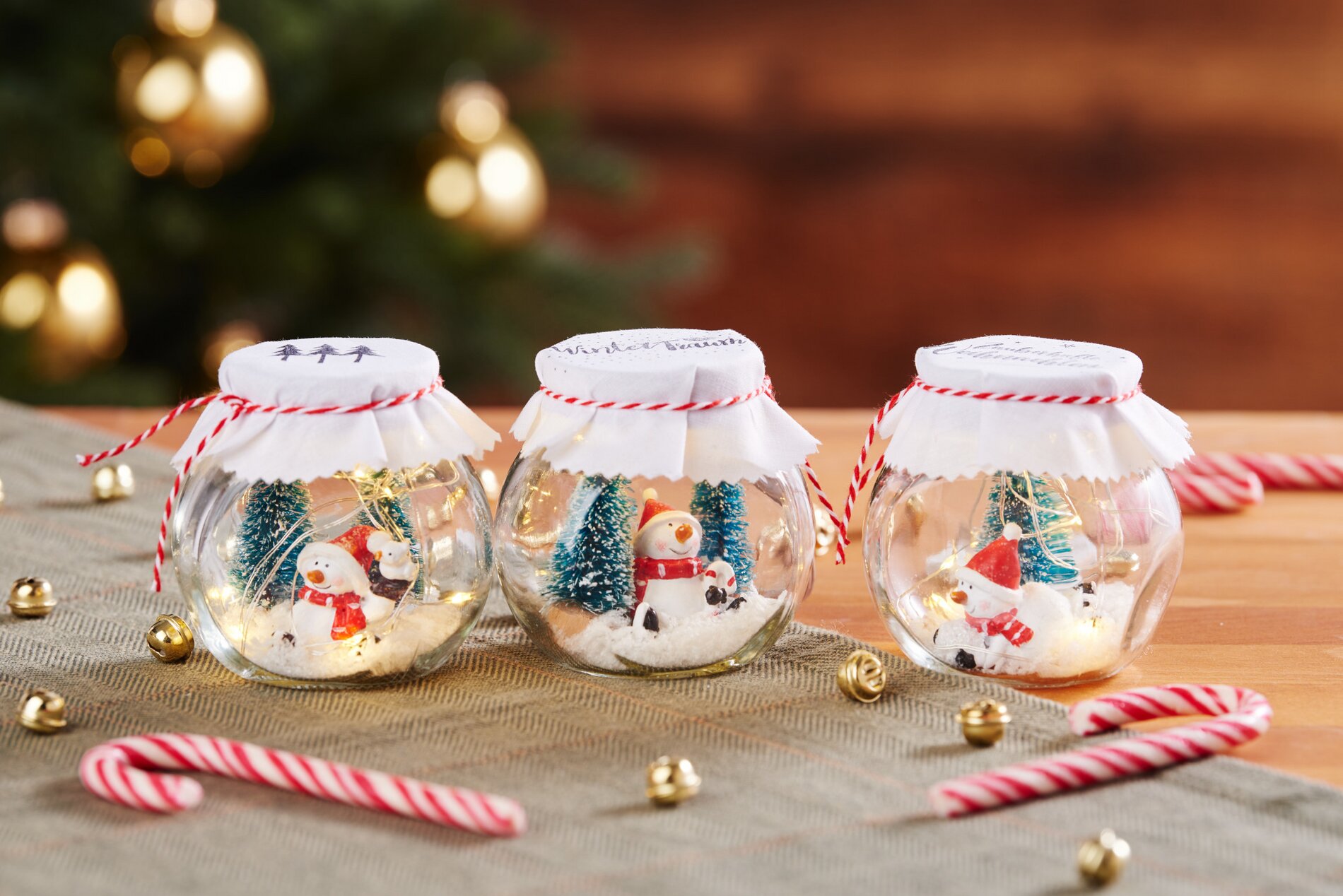 Mondo in miniatura in un barattolo con tappo a vite Per prima cosa inserire nel barattolo una statuetta e gli alberi di Natale e fissarli con un po' di colla a caldo. Aggiungete quindi la