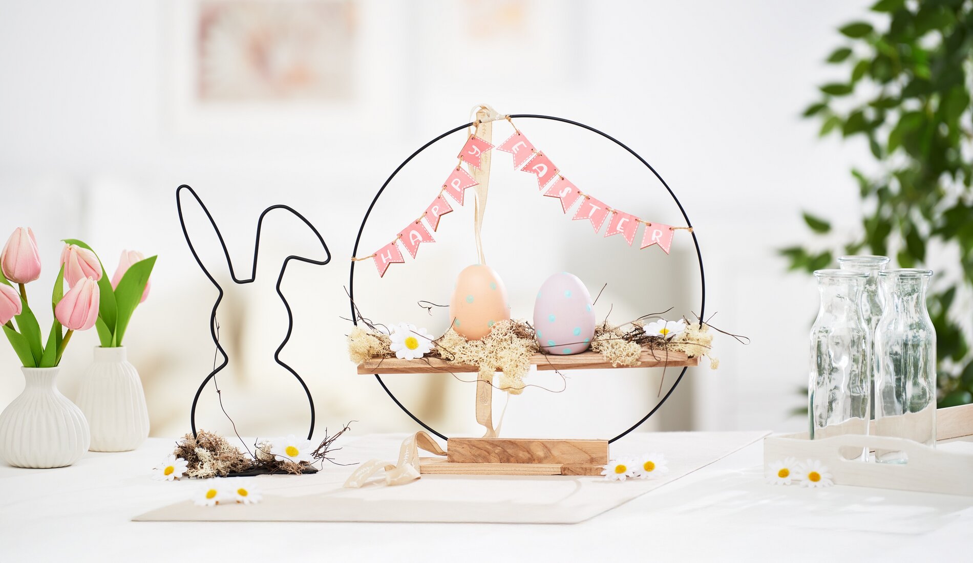 La disposizione dei singoli elementi decorativi è particolarmente divertente. Iniziate incollando con cura le uova dipinte sulla tavola di legno. Per tenerle in posizione si può usare la colla artigianale, ma si può anche usare la colla a caldo. Decorate la superficie decorativa in legno con muschio islandese, filo decorativo e fiori di margherita. Potete anche utilizzare del nastro per posizionare perfettamente il bunting e creare un aspetto armonioso.