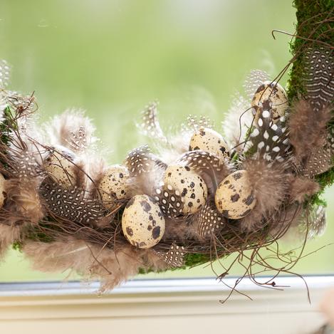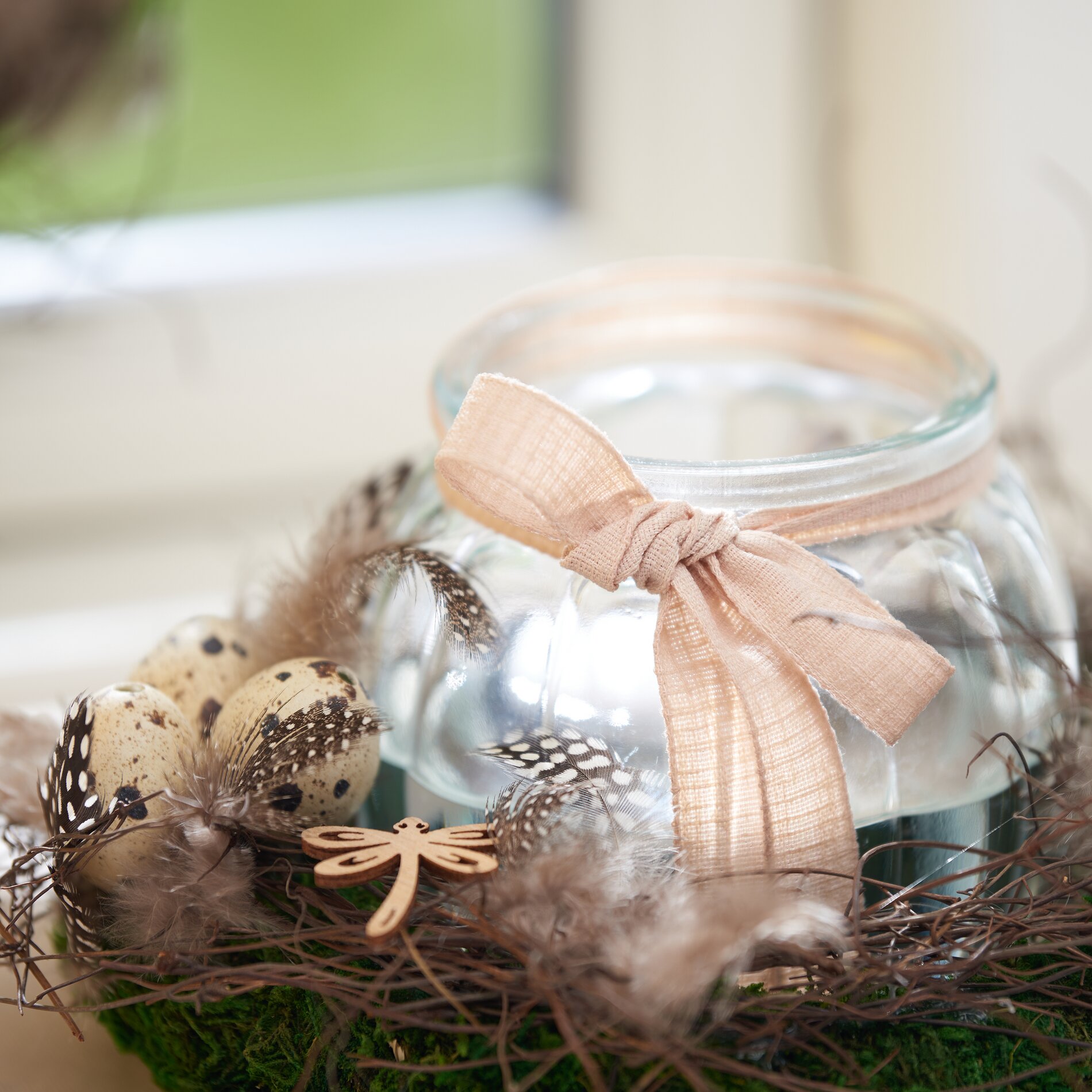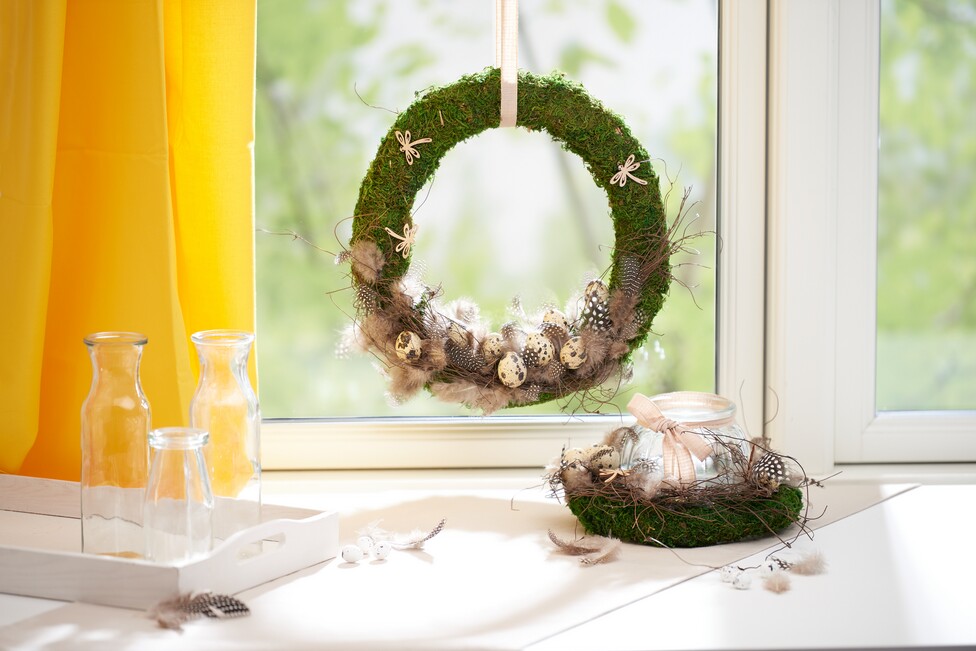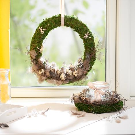 Questa idea è un buon esempio di crafting decorativo con materiali naturali per il periodo pasquale. Ghirlande di muschio, salice decorativo e altro ancora portano la magia della natura direttamente nella sua casa. Si lasci ispirare e crei le sue decorazioni pasquali naturali con i nostri materiali!