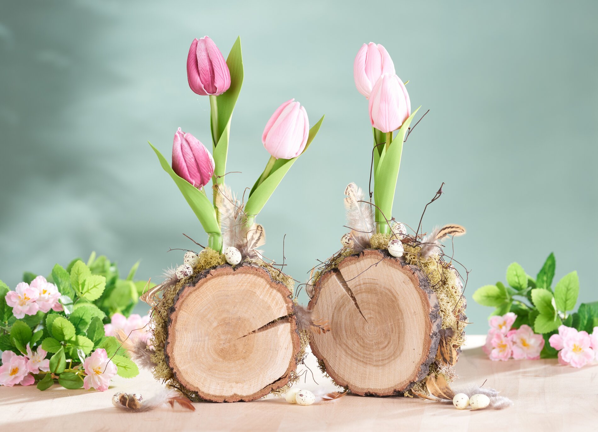 Quando tutto è asciutto, riempire gli spazi vuoti con il muschio islandese appropriato. Decorare quindi i dischi d'albero con salice, piume e uova. Infine, potete posizionare i tulipani nelle provette.