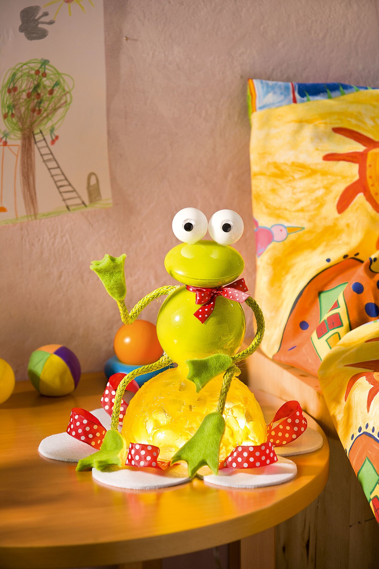 Per le braccia e le gambe, utilizzare la pistola per colla a caldo per fondere i fori nella sfera centrale, sbavare e incollare il filo della figura. Incollare le mani e i piedi, fissare la palla grande al fiore di feltro utilizzando il disco da taglio e i passanti del nastro a punti. Infine, incollare gli occhietti e posizionare un filo di luci LED sotto la semisfera grande.