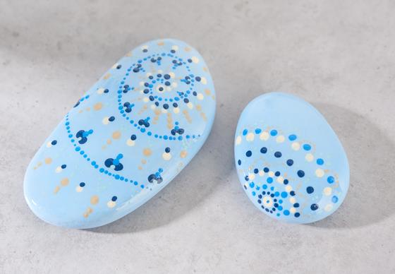 Per dipingere i punti veri e propri si usano bastoncini di legno rotondi: basta immergere la punta rotonda nella vernice e poi applicare i punti, in questo caso in linee ondulate. I diversi spessori dei bastoncini di legno danno luogo a punti di diverso spessore.