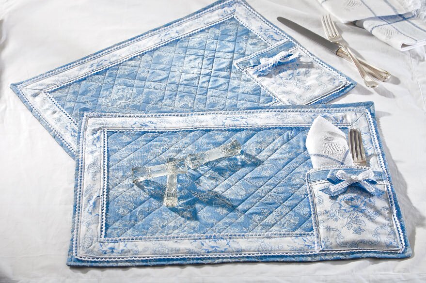 Per la tasca portaposate , accostare i lati destri degli spazi bianchi e grigi, cucirli insieme tranne una piccola apertura e risvoltarli. Cucire delle strisce strette dal tessuto blu, che verranno poi cucite al bordo superiore della borsa insieme al pizzo. Cucite la borsa portaposate finita con il pizzo sulla tovaglietta.