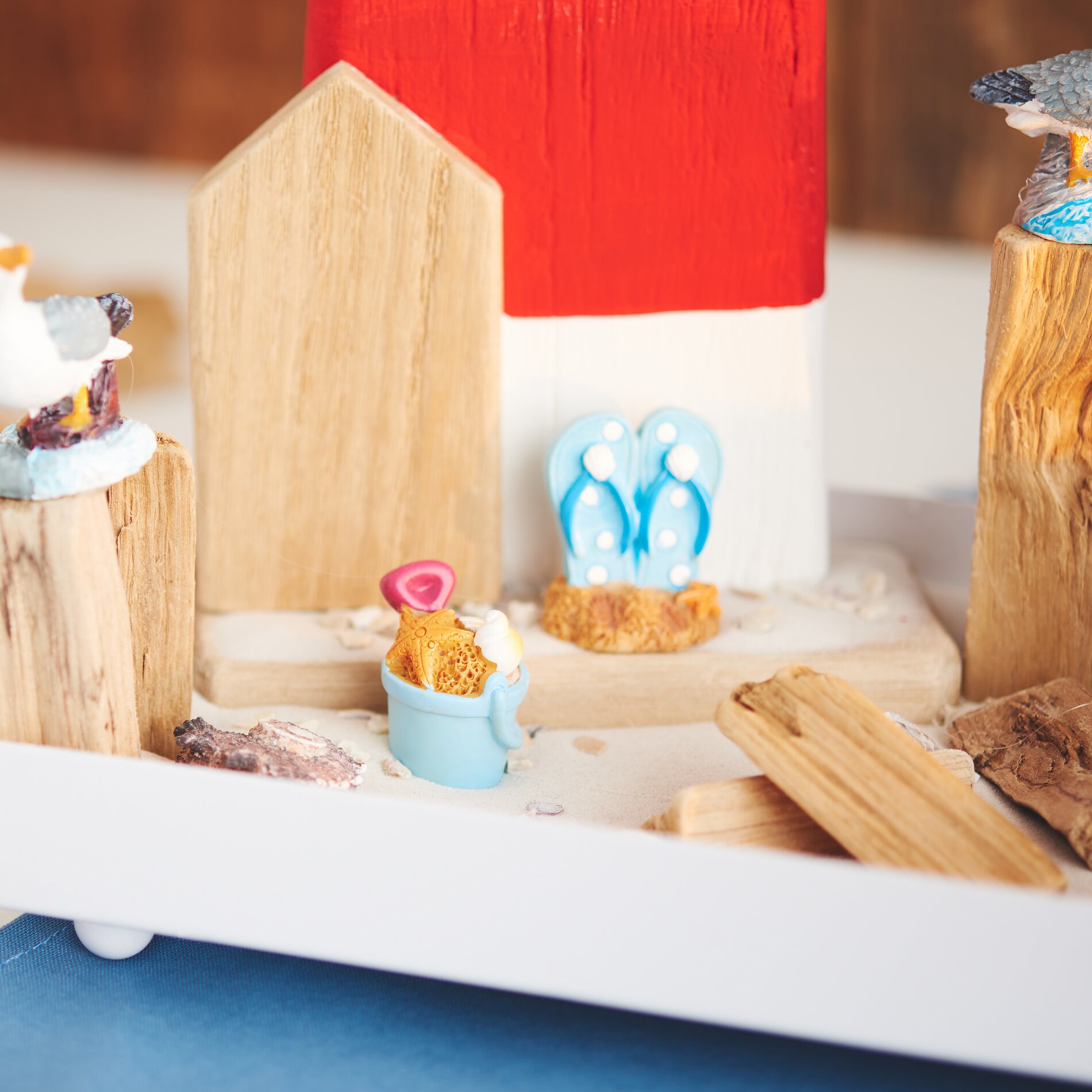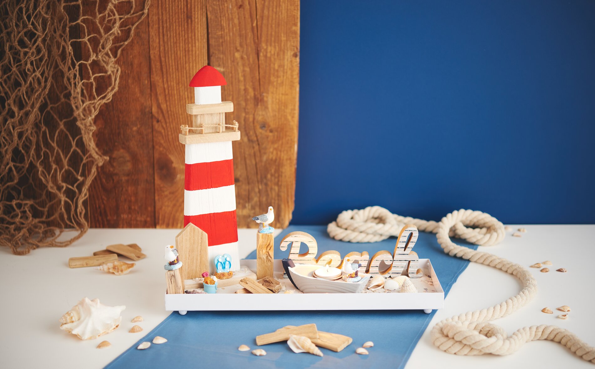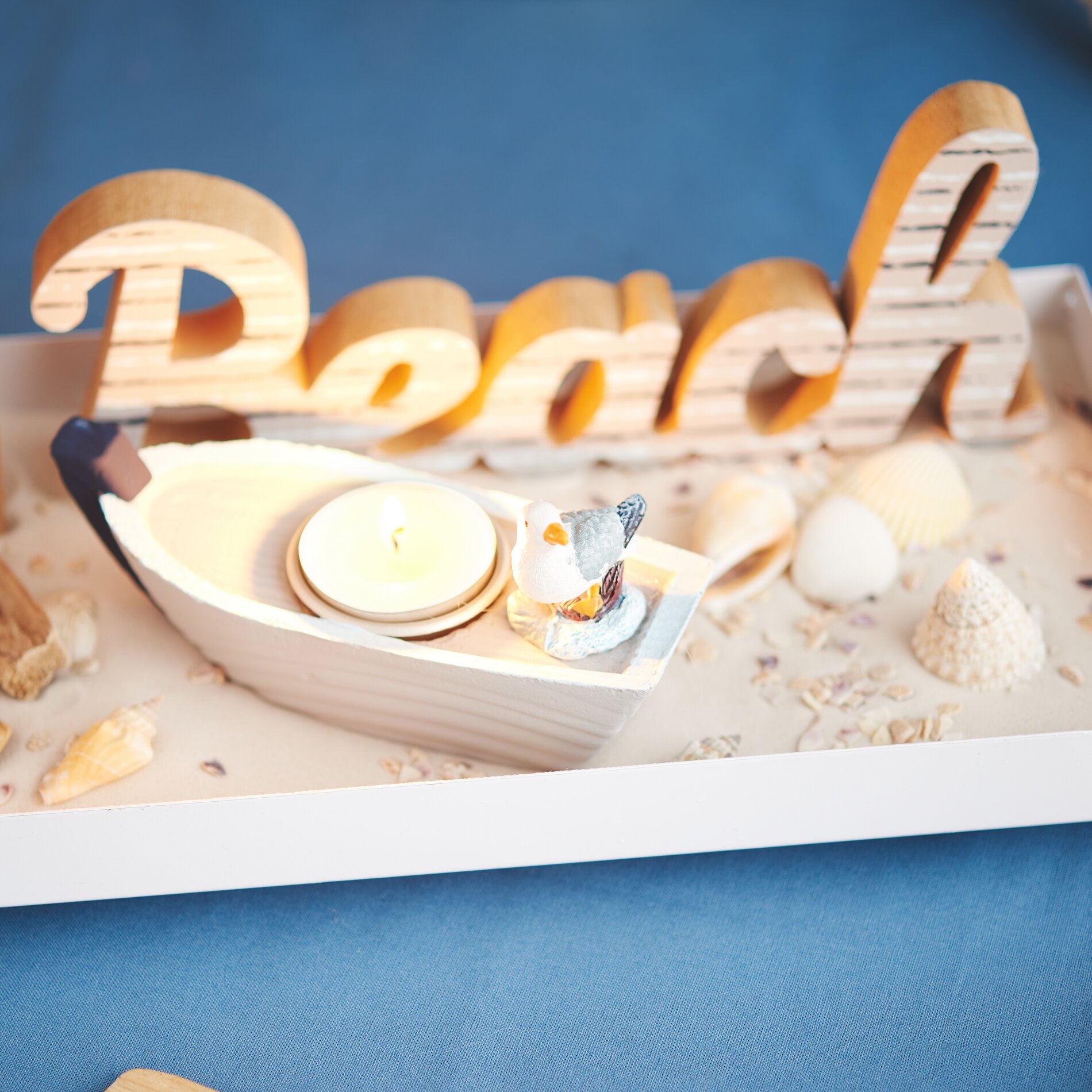 Design the trayPlace all the decorated elements on your tray. think about an arrangement that you like best. You can place the lighthouse and the tea light further forward or to the side so that everything stands out.