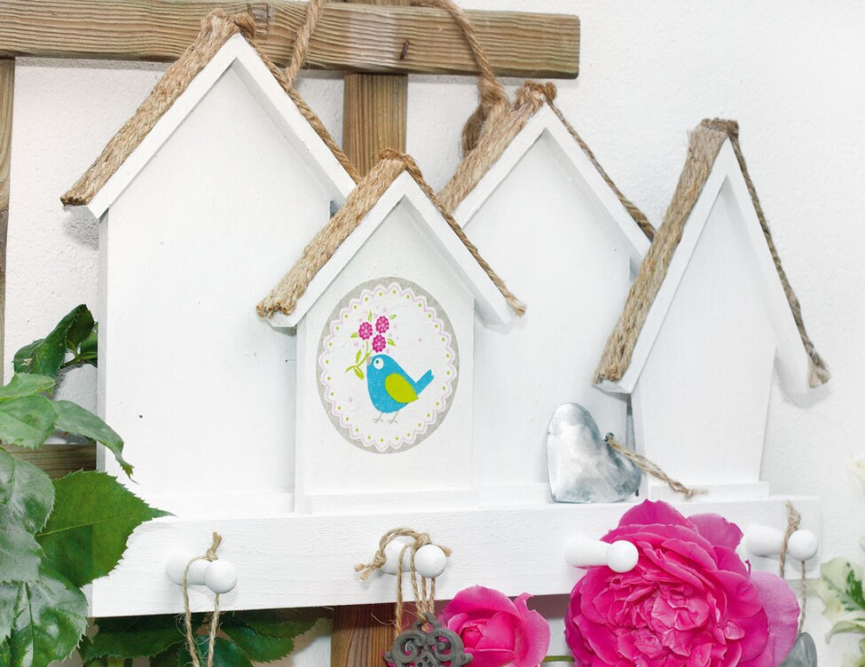 Decorate the wall shelf in white and let it dry. Cut the motif from Napkin and stick it onto the shelf using Napkin varnish . Fix the Jute-Cord with hot glue in layers on the roofs of the houses. Attach a jute cord to the board as suspension.