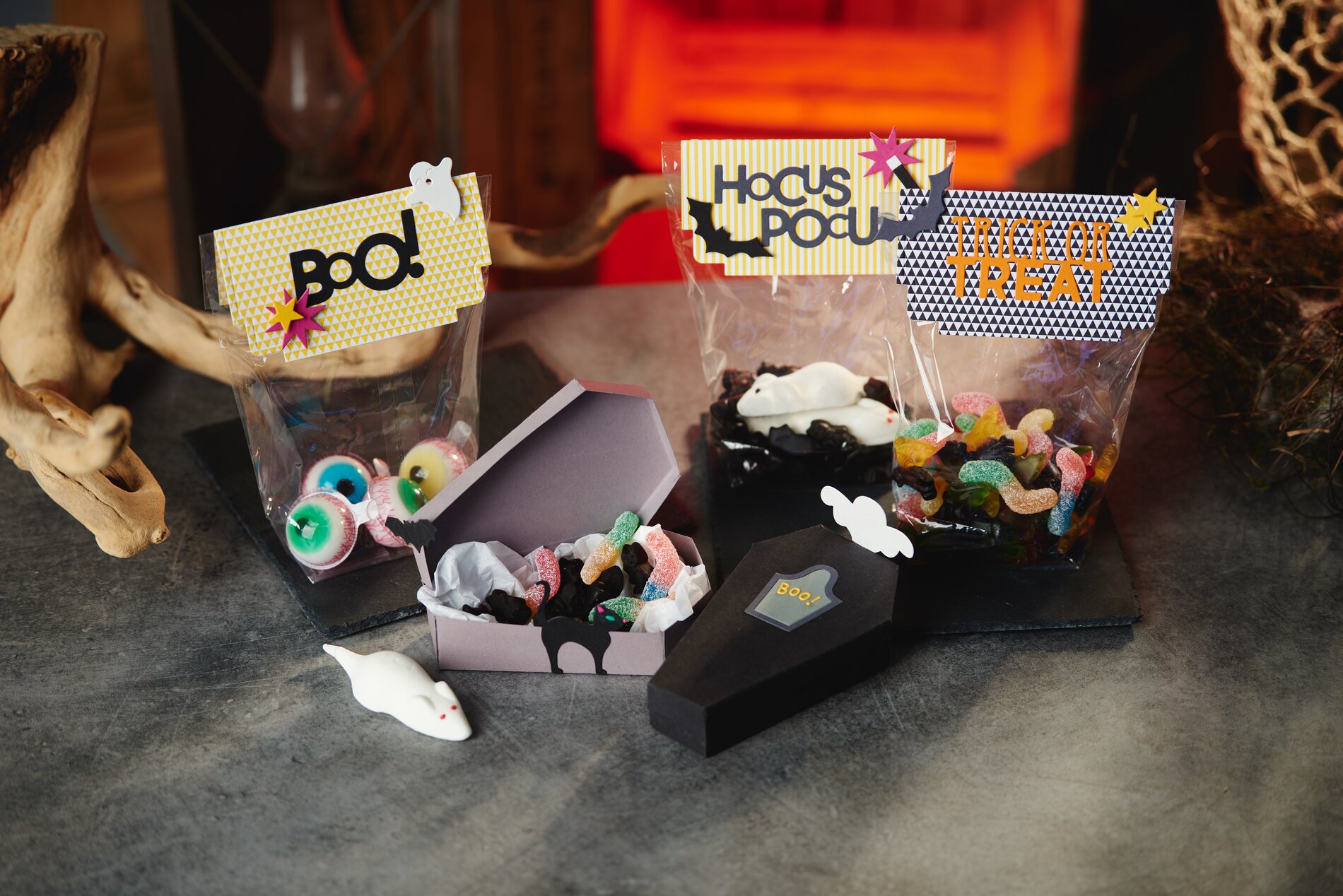 Following the Halloween motto "trick-or-treat", pack your spooky sweets in ghoulishly beautiful presents such as a coffin or in bags with matching lettering.