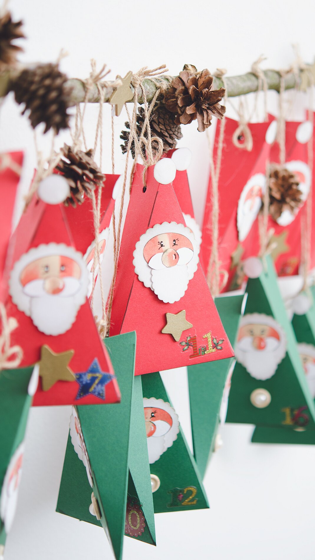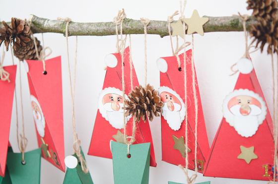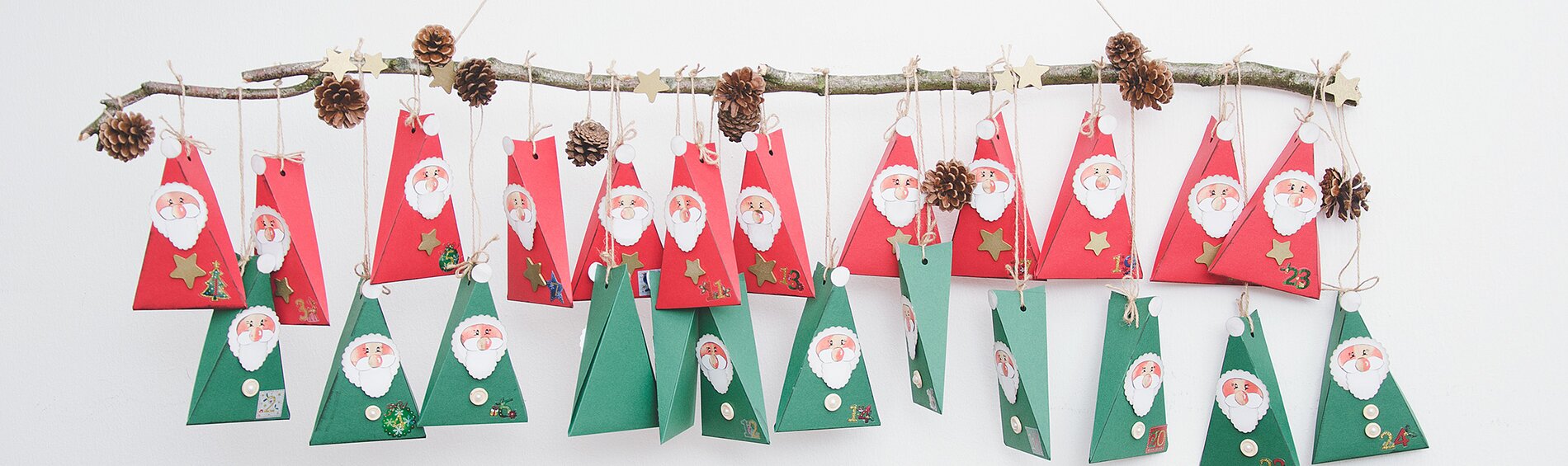 The Advent Calendar consists of 24 Craft cardboard sheet-boxes, which are hung decorated to small Santa Clauses on a branch.