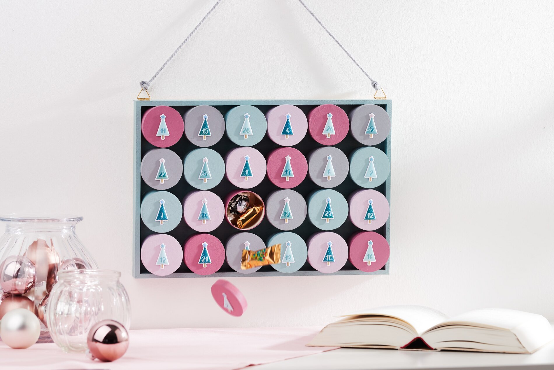 Stick the 3Dadvent numbers-Stickers onto the chip boxes and attach the cotton cord to the eyelets for hanging. Now the advent calendar is ready to be filled: simply open the lids and place small surprises in the tins.