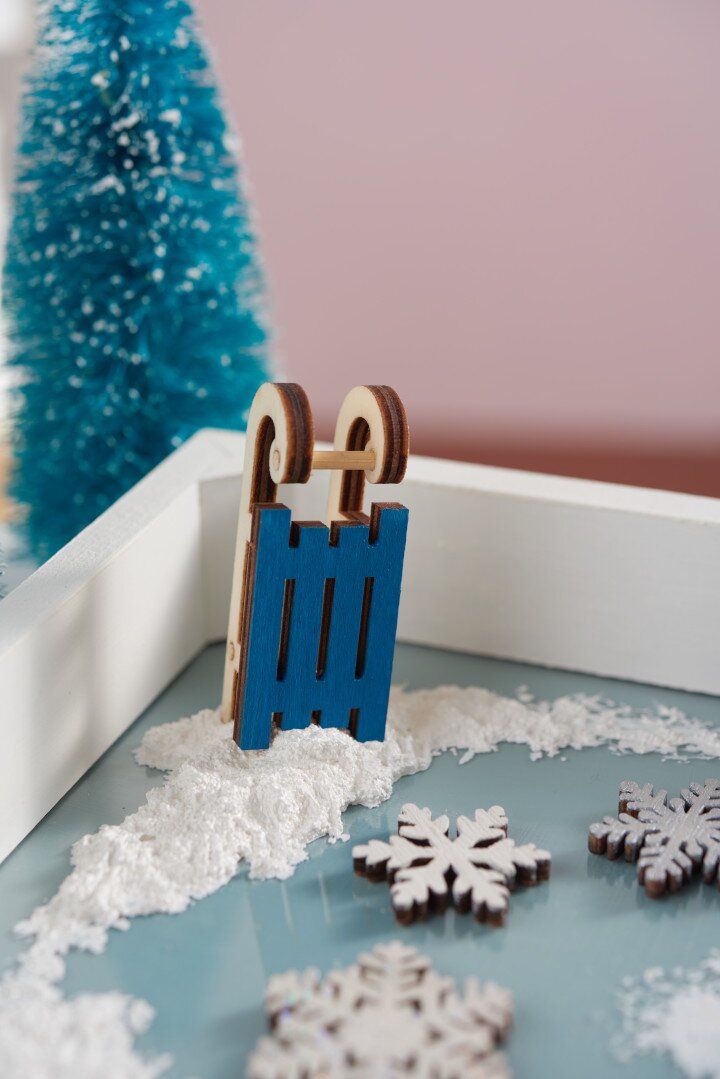 Decorate other surfaces of the tray with the decorative snow, place and fix with it also the sleigh.
