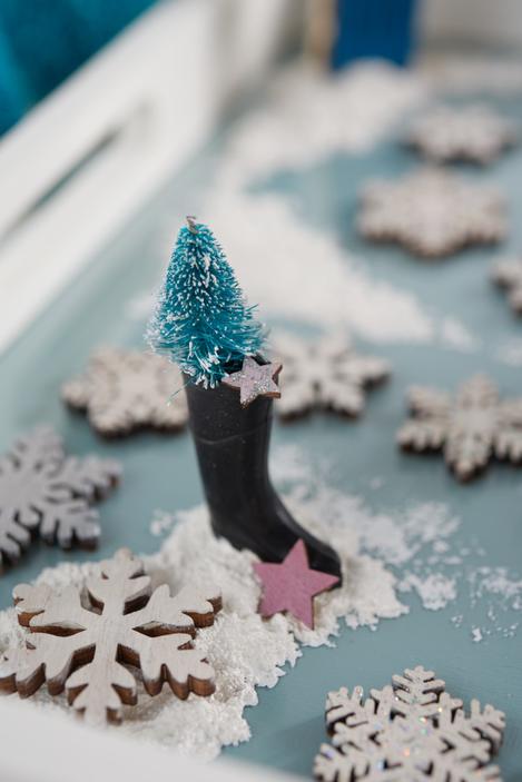 To make the fir tree and the last snowflake lie especially high, simply cut a Styrofoam ball in half and glue it to the plate, then cover it with decorative snow. Decorate the fir tree and the rubber boots with small stars, and the boots with a very small fir tree. Press the miniatures into the decorative snow while it is still wet. They will be well fixed in this way.