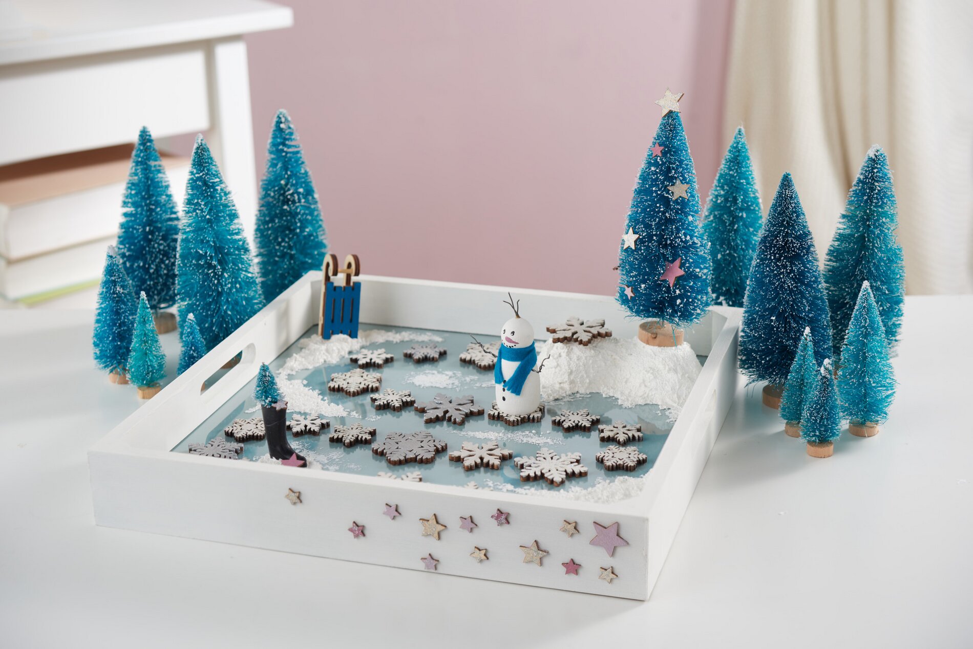 Glue small decorative stars to the outside of the tray and place the snowman on the first star. Now the Advent season can begin!