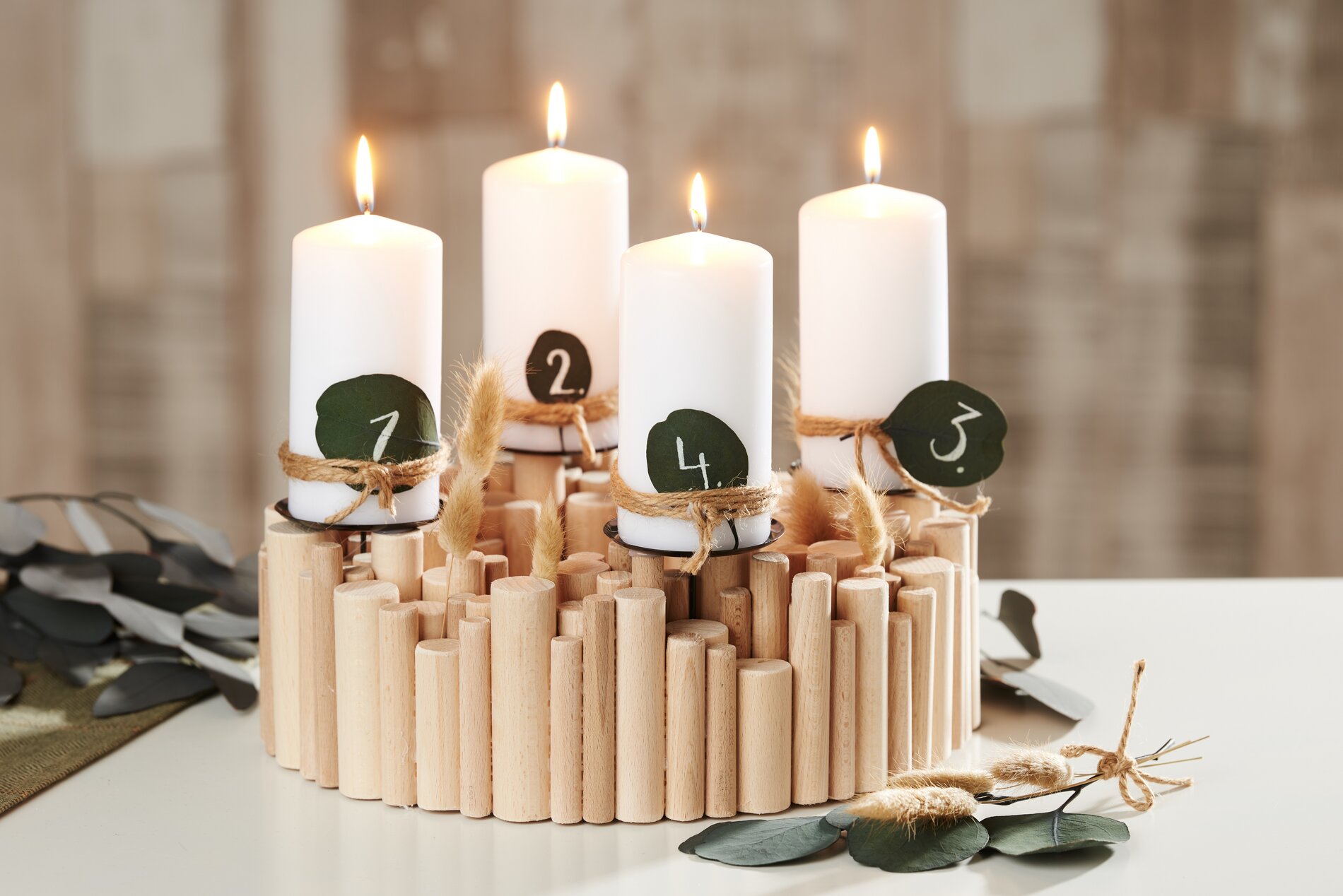 An Advent wreath is a must during the Advent season. These are becoming more and more different, whether with fir trees, dried flowers or, in this case, round beech sticks. Create a modern Advent wreath with the help of these instructions.
