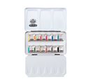 ACADEMY Watercolor box with 12 half cups from Schmincke in a top quality for beginners and advanced painters A high-quality and professional metal box with a metal ring on the bottom for a firm hold in the hand. Inside the box is a metal palette for mixing the colors, which also serves as a cover for the colors. This handy watercolour box is also ideal for travelling and holidays.
