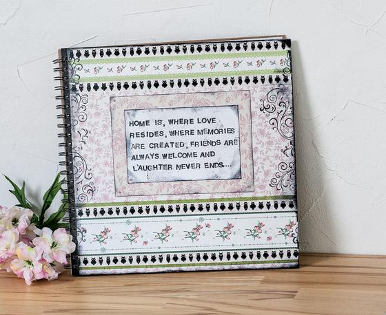 Choose a sheet from the scrapbook block and stick it on the cover, simply cut off the excess Paper . Make a white paper cutout with the dimensions 10 x 15 and stamp the slogan. Now make a suitable cutout with the dimensions 18.5 x 13 from Scrapbook paper. Wipe the edges with the stamp
