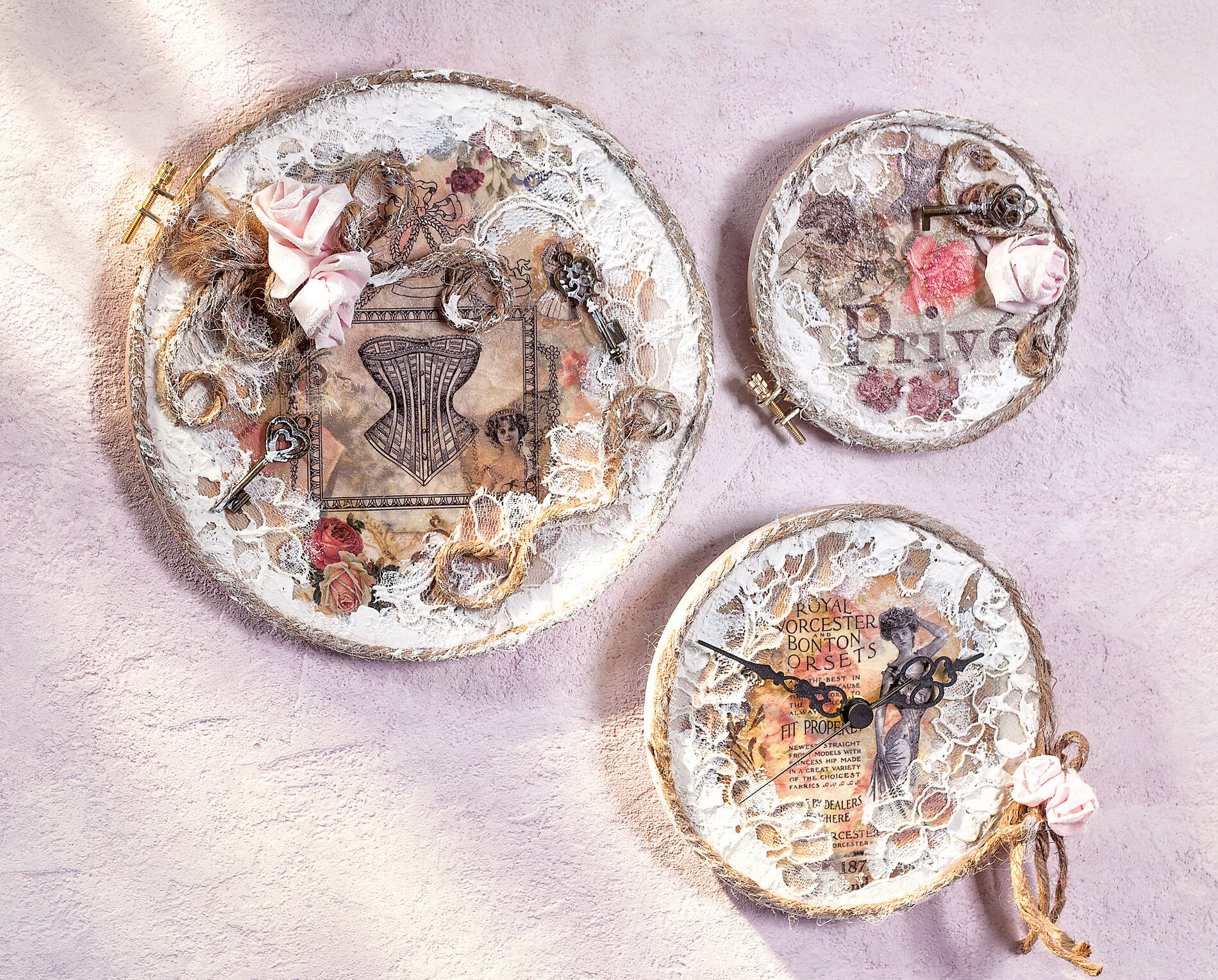 In these three collages different materials and elements are combined to a romantic ensemble. The special feature is the round shape as well as the clock that sits in the middle ring.