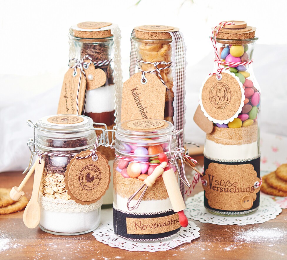 2. Next, you need a suitable preserving jar or an oblong glass jar for the dry ingredients of your recipe (e.g. VBS Glass bottles "Milk" or VBS Storage jars "Mini"). The container should be washed and dried well before. Also note the quantities - the glasses should be filled to the brim, otherwise the individual layers will shift. If the glass is too big, they can be a little more generous with sprinkles, rasps or Chocolate . This way you can keep the proportions of your recipe.