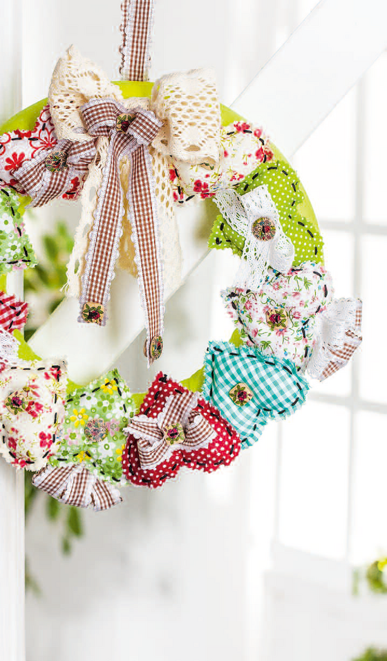 Cut the may-green Cotton fabric into wide strips with the serrated scissors, wrap them around the Polystyrene ring and pin the folded end tightly with roman-style sticks on the back. Also use the pinking shears to cut two equal 10 x 10 cm hearts from the different fabrics in the fabric packages