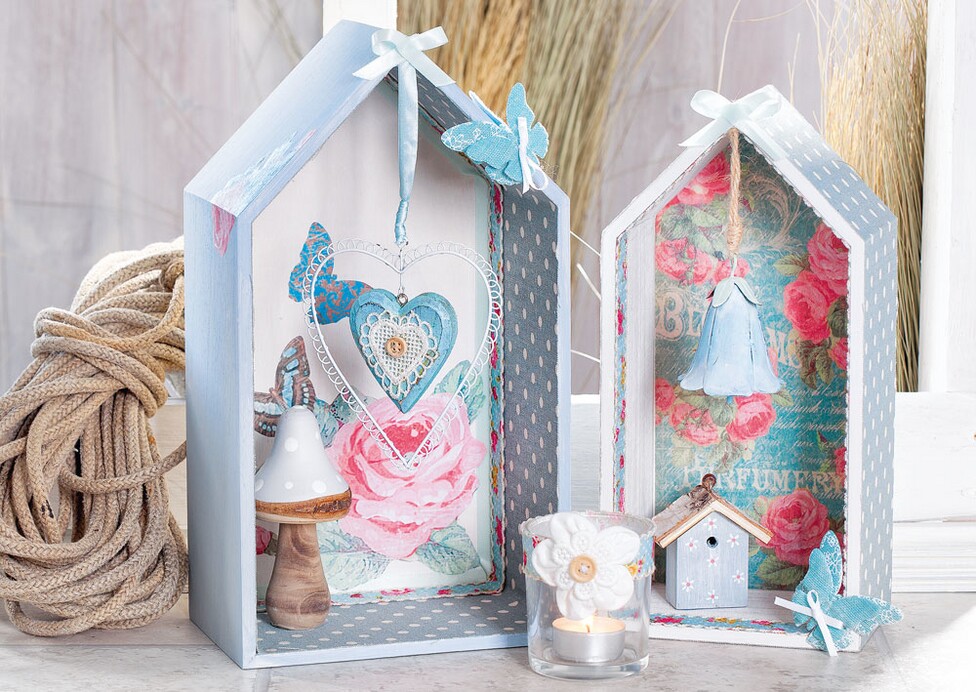 Lovingly painted, pasted and decorated, the boxes "Living Home" are a nice decoration idea for your home. Whether standing or mounted on the wall - in the boxes you can present decorative figures or pendants in a particularly beautiful way. The house shelf boxes are made of plywood and can therefore be painted or glued. In our handicraft instructions we use vintage paint for the primer and Straw silk paper with different motifs for gluing. The best is to make it right away!