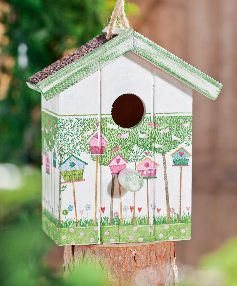 An individually designed nesting box is always a real eye-catcher in the garden and possibly the new home of native songbirds. We have painted a nesting box in natural shades of green and pasted Napkin technique on it. Of course you can also choose any other Napkins or colours and thus give your bird house your own personal touch.