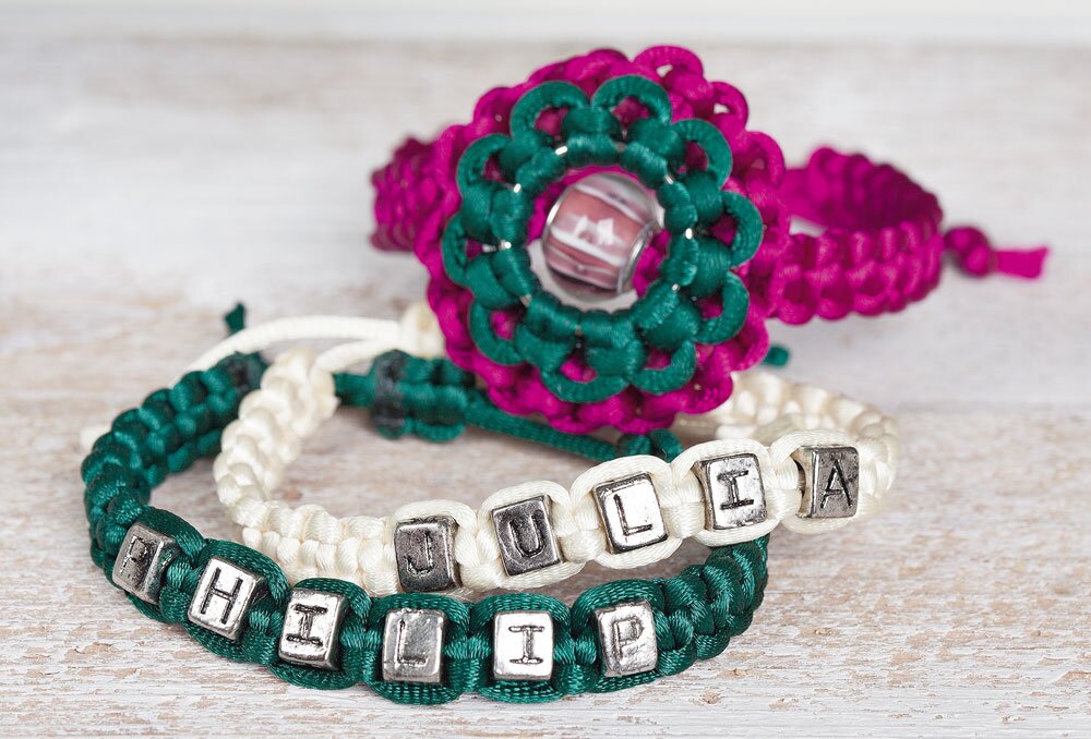Bracelets in the Macramé-technique are quickly and easily recreated. This requires only a little skill and endurance in knotting. Small beads provide for the individual look. Decorated with alphabet beads, the Macramé-bracelet as a gift can be a great proof of friendship