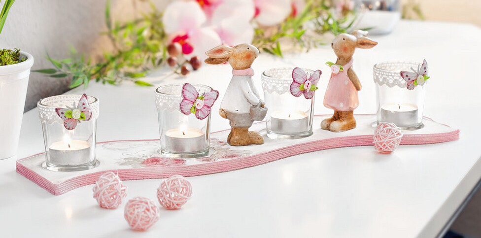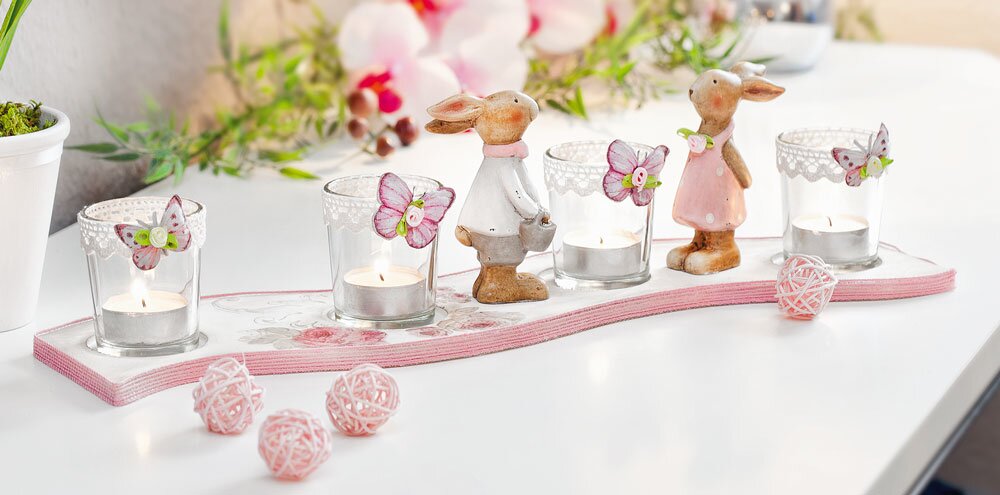 This Tealight holders is a quick and charming Easter decoration, which can be easily recreated with these craft instructions. With fine lace, metal butterflies and floral pattern this decoration idea brings spring into your home. The rabbit pair lets the Tealight holders appear temporarily in an Easter light.