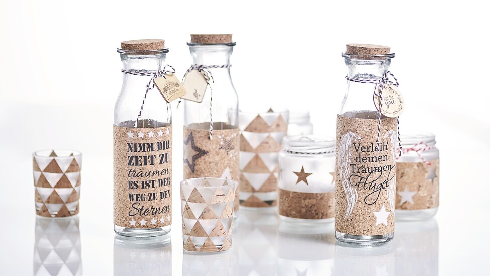 Beautiful vases and lanterns can be transformed into real eye-catchers with just a few materials - with cork and water transfers!