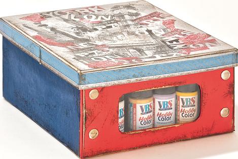 Roughly grind all edges with a sanding block to create artificial traces of use, which can also be highlighted by wiping over with stamping ink. Finally cut the grey Felt to size and glue it with Handicraft glue into the storage box, so nothing can slip and rattle.
