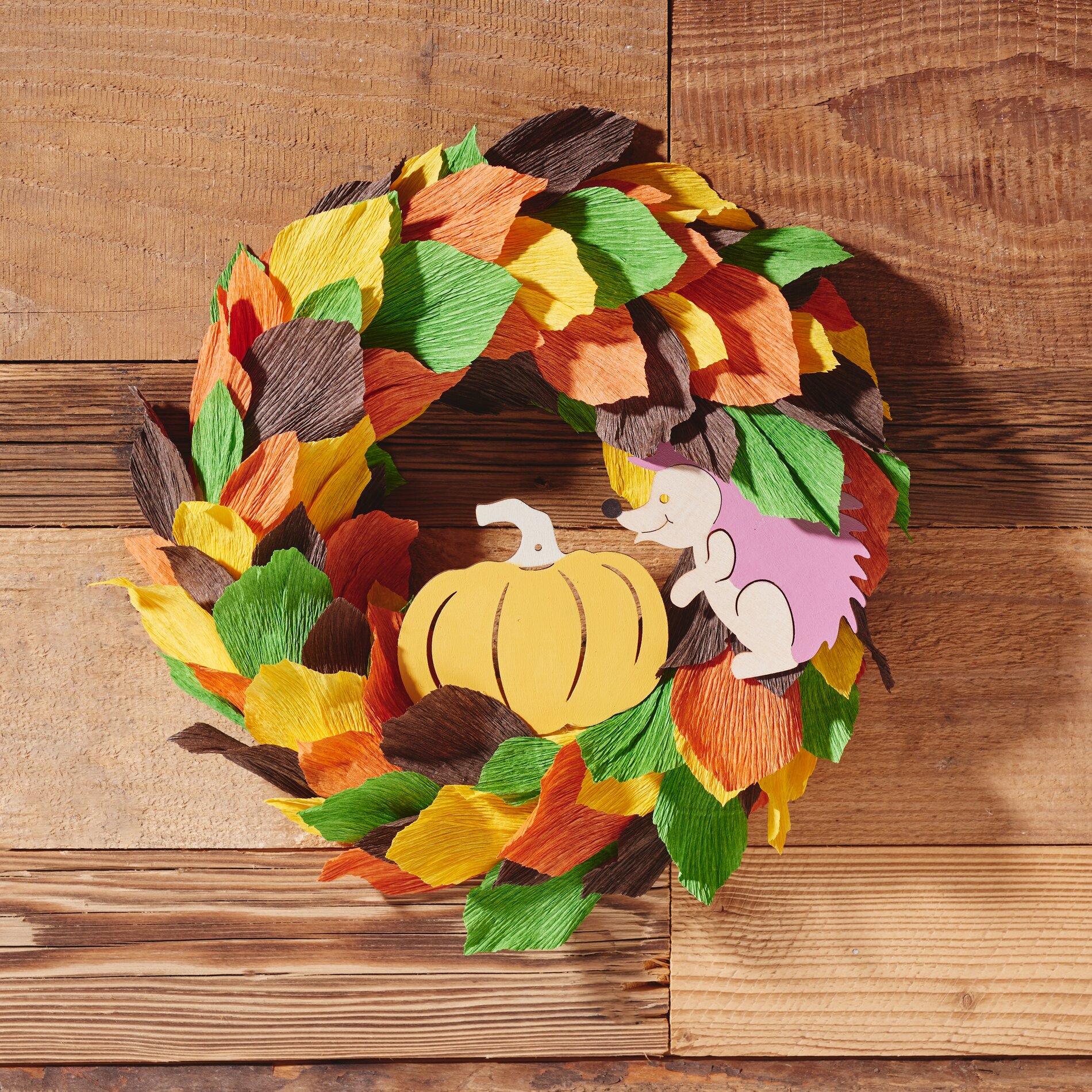 This beautiful autumn wreath consists of a polystyrene ring, that has been decorated with leaves made of crêpepaper and wooden pendants. Our template for the leaves is easy to transfer and the leaves decorate the wreath beautifully in this idea.