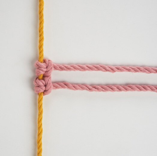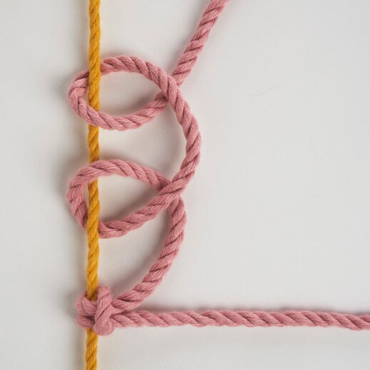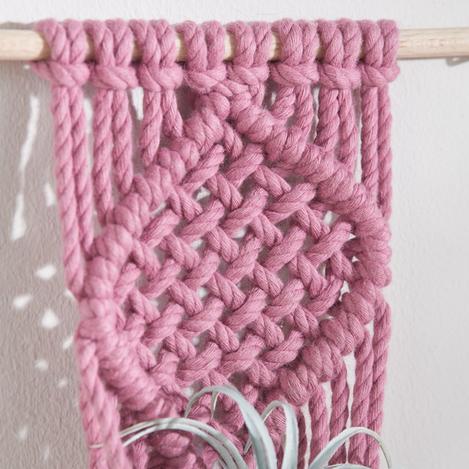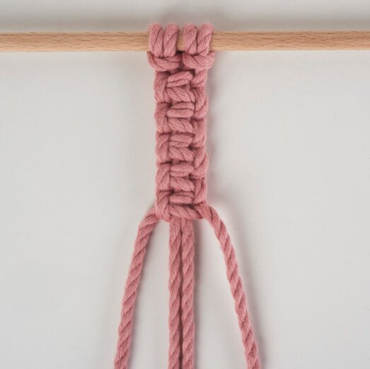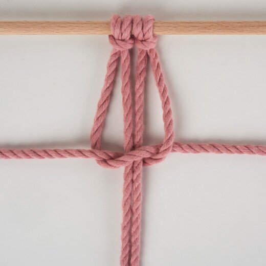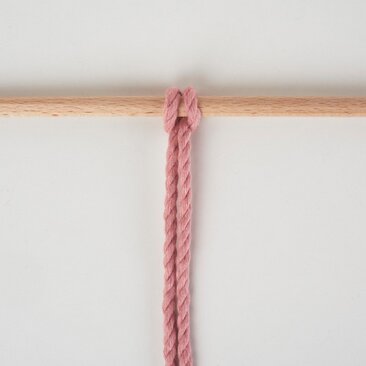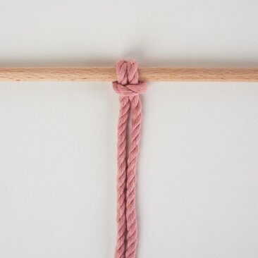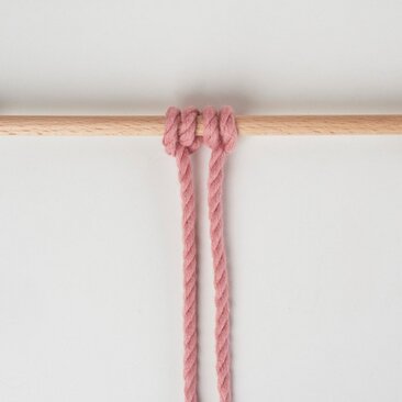 To get started, you will need a firmly fixed attachment point for the first knot. For example, stretch a wooden stick between two shelves, use a coat hanger fixed to the coat rack, or bend a tightly fixed wire loop. Will the fastening device be integrated into the macramé work? A hanging ring? The wooden rod? Then this must also be fixed for knotting.