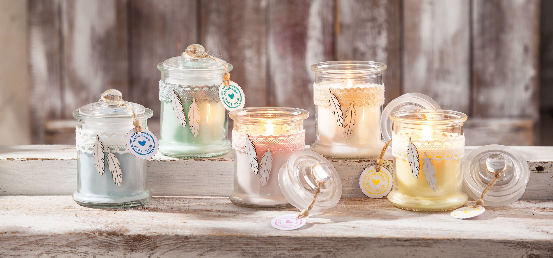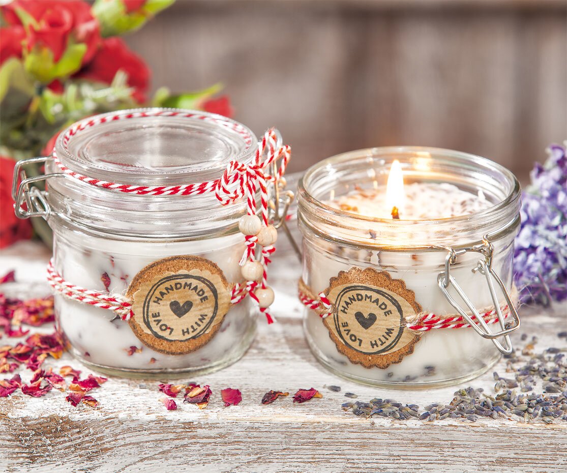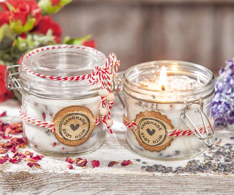 For our creative ideas we mixed organic wax with wax colouring granulate, added some candle scented oil and filled the finished wax mass into decorative storage jars prepared with candle wicks