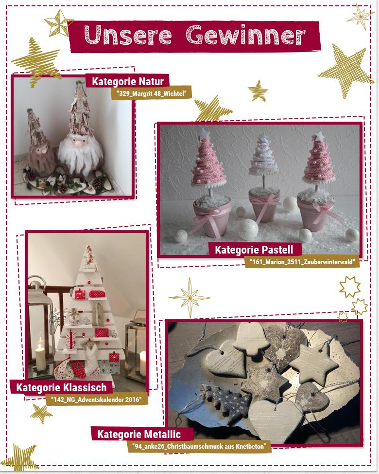 Für unseren diesjährigen Bastelwettbewerb unter dem Motto „Welcher Weihnachts-Basteltyp bist du?“ haben wir eine große Anzahl an Ideen aus den Bereichen Metallic, Natur, Pastell und Klassisch erhalten. Unsere Jury hatte die schwierige Aufgabe aus über 400 eingeschickten und zum Wettbewerb zugelassenen Ideen vier Gewinner auszusuchen. Heute stehen die vier Glücklichen endlich fest. Wir gratulieren ganz herzlich!