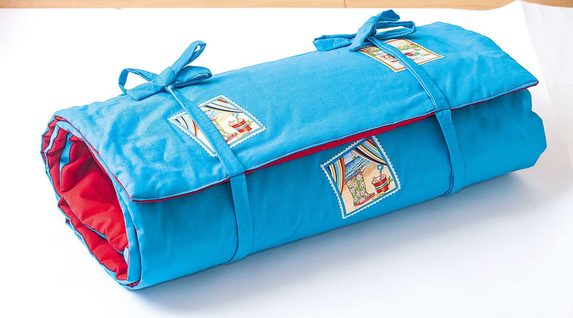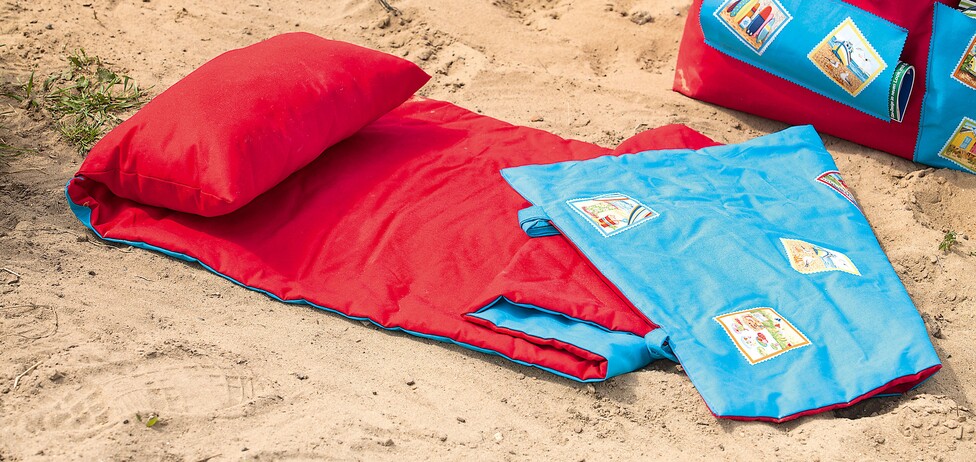 The large beach sheet with the sewn-in pillow can be fastened with the ribbons to form a handy roll that even fits into the large, self-stitched beach bag. The cut is so simple that even sewing beginners can rework it. So nothing stands in the way of a great bathing day.