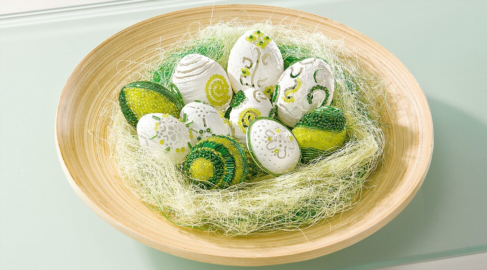 For Easter you must have homemade Easter eggsto keep for yourself or to give away. On these beautiful eggs are filigree patterns milled out and glittering beads glued on. You can choose your favourite colour or follow our suggestions.