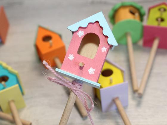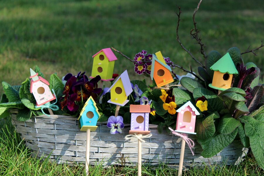 No matter whether you have a single flower pot, a planter or a floral arrangement. Matching decoration must not be missing to make the whole thing complete. Especially in springtime, there are many possibilities and one of them are these colourful mini birdhouses as flower plugs.