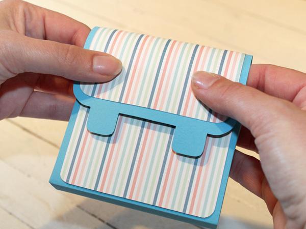 Den schmalen Streifen klebt ihr mit etwas Bastelkleber an beiden Enden oben auf den Ranzen an. Solange der Kleber noch nicht angezogen hat, könnt ihr den Henkel ausrichten.