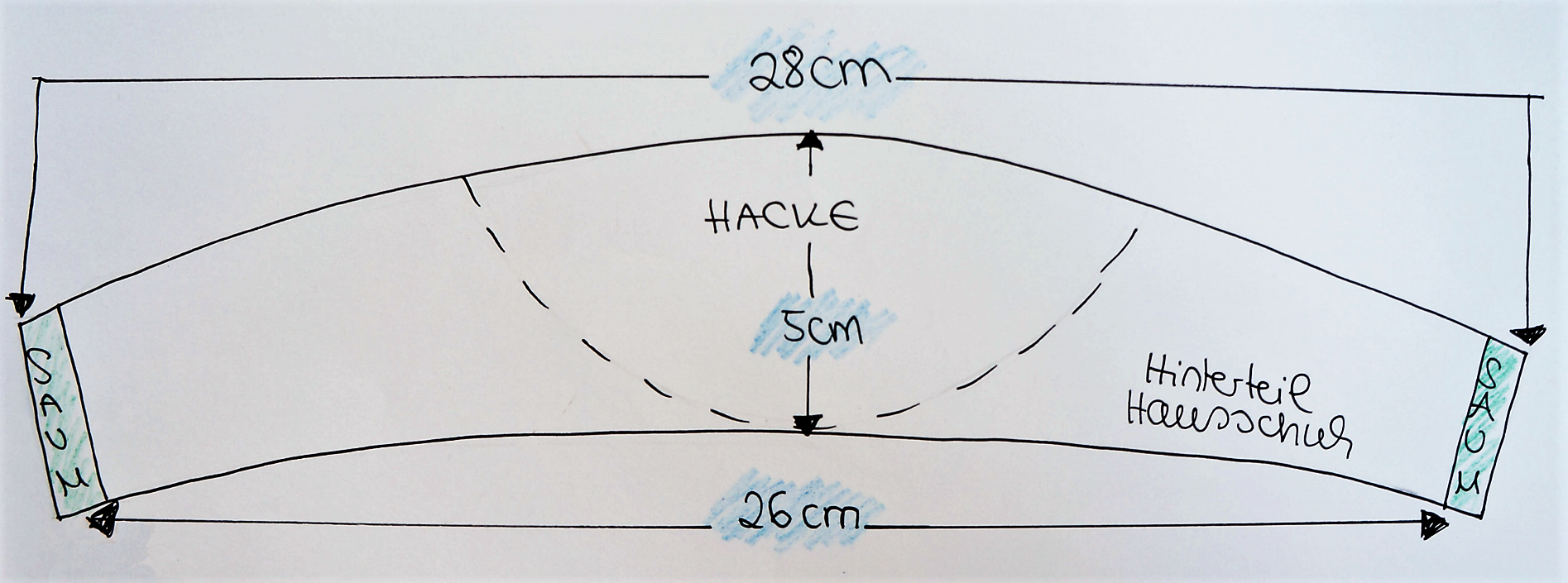 Zu allererst erstellen wir uns eine Vorlage für die Hausschuhe in der jeweils richtigen Größe.  Die hier verwendete Vorlage ist für einen Hausschuh der Größe 37.  Ihr könnt diese sehr gern benutzen, wenn ihr mögt oder ihr zeichnet euch ganz einfach eine eigene.  Für den Hausschuh in dieser Anleitung benötigen wir eine Schnittvorlage für drei Teile aus Stoff. Dem Vorderteil, der Hacke und dem Hinterteil des Schuhs.