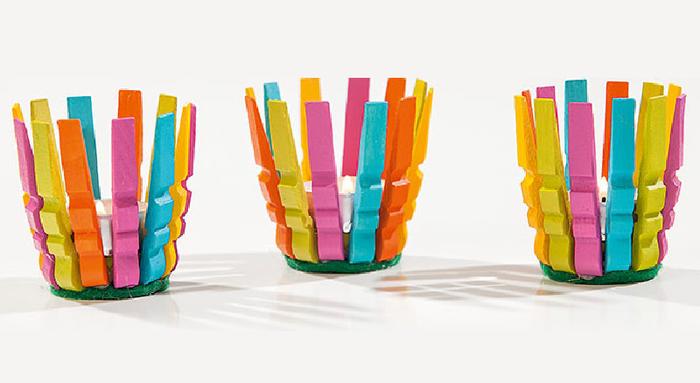 Einerseits wird ja auch gebastelt, damit nichts übrig bleibt und weggeschmissen werden muss. Beim Basteln wird gerne mal um die Ecke gedacht, damit aus scheinbaren Wegwerfartikeln und Resten Neues hergestellt werden kann. Häufig fällt in diesem Zusammenhang der Begriff Upcycling. Statt des Recyclings (Wiederverwertung) eines Gegenstandes bekommt dieser beispielsweise eine neue Funktion, wird aufgehübscht und damit letztendlich aufgewertet. Die englische Wortzusammensetzung aus „up“ und „recycling“ bezeichnet diesen Vorgang. Damit die Holzteile eurer Wäscheklammern eben nicht in den Abfallzyklus geraten, könnt ihr diese bunten Teelichthalter daraus machen.