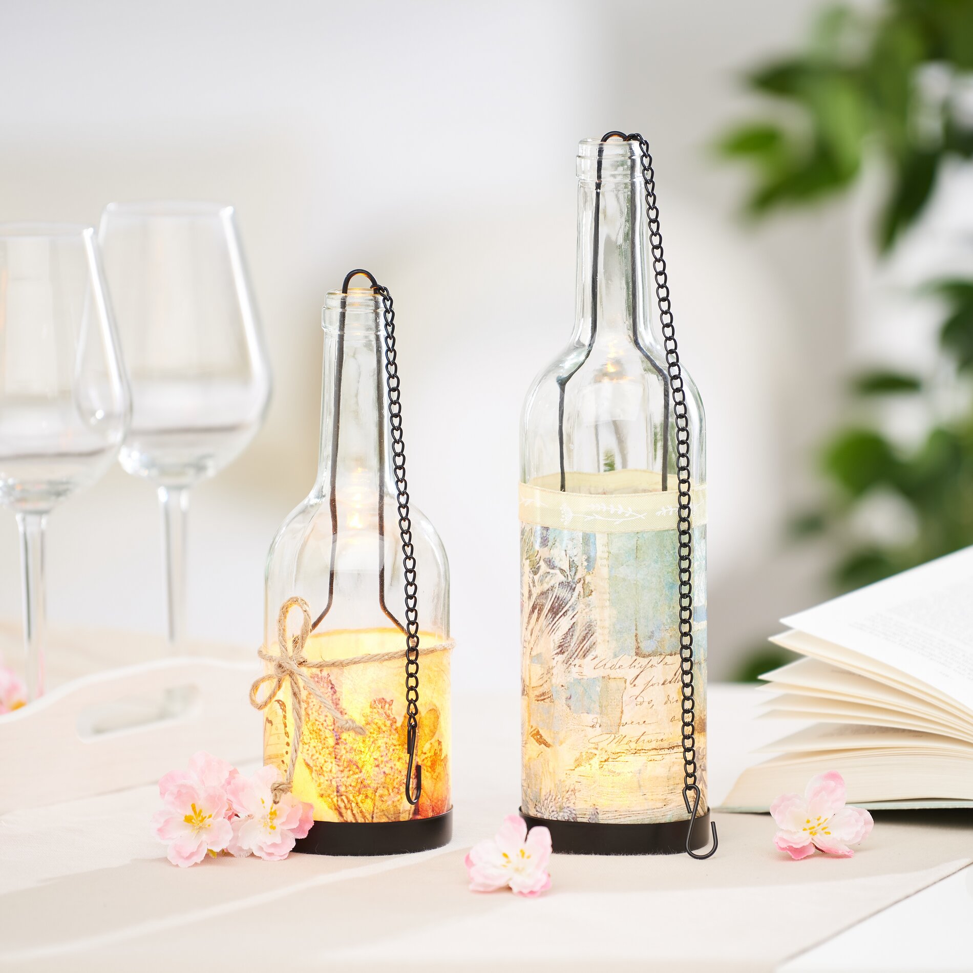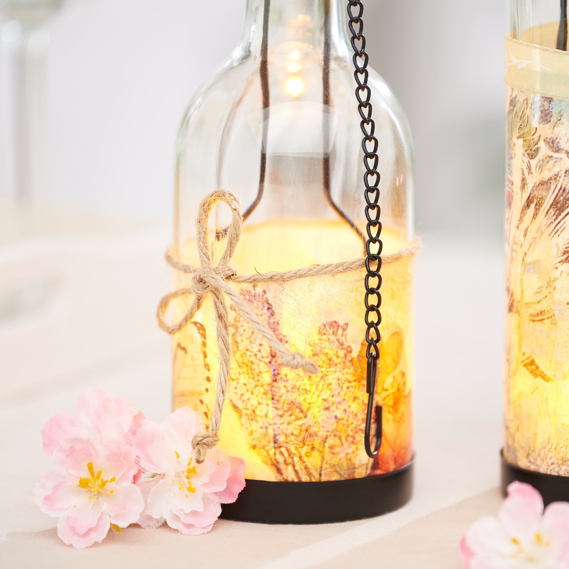 If you now place an LED tea light in each bottle, your bottle lanterns are ready to hang.