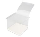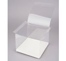 A box for money and voucher gifts in different sizes. The standing surface of the box consists of embossed, firm photo cardboard in white. The box is made of transparent plastic and has a high-quality finish