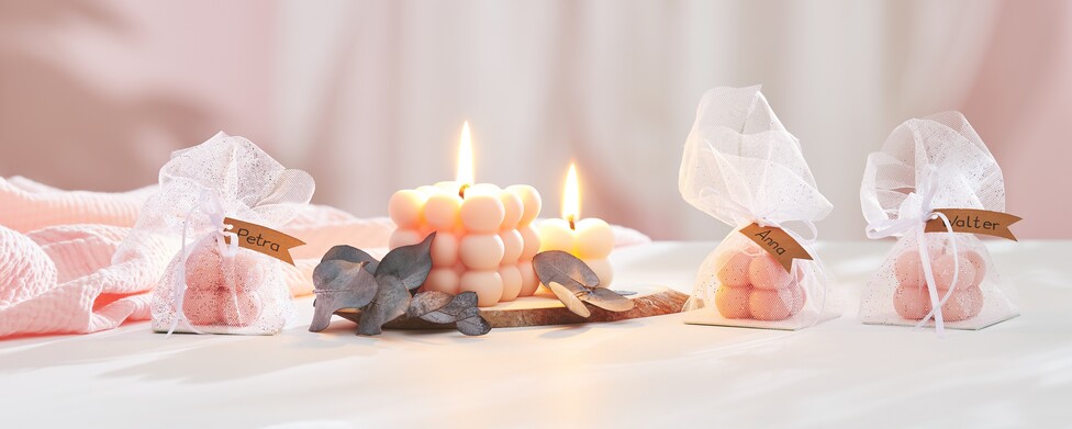 These beautiful bubble candles make wonderful gifts, for example as a wedding present. Thanks to the choice of colors, the candles can be perfectly adapted to locations or color concepts. A personal detail at your wedding that will enchant your guests.