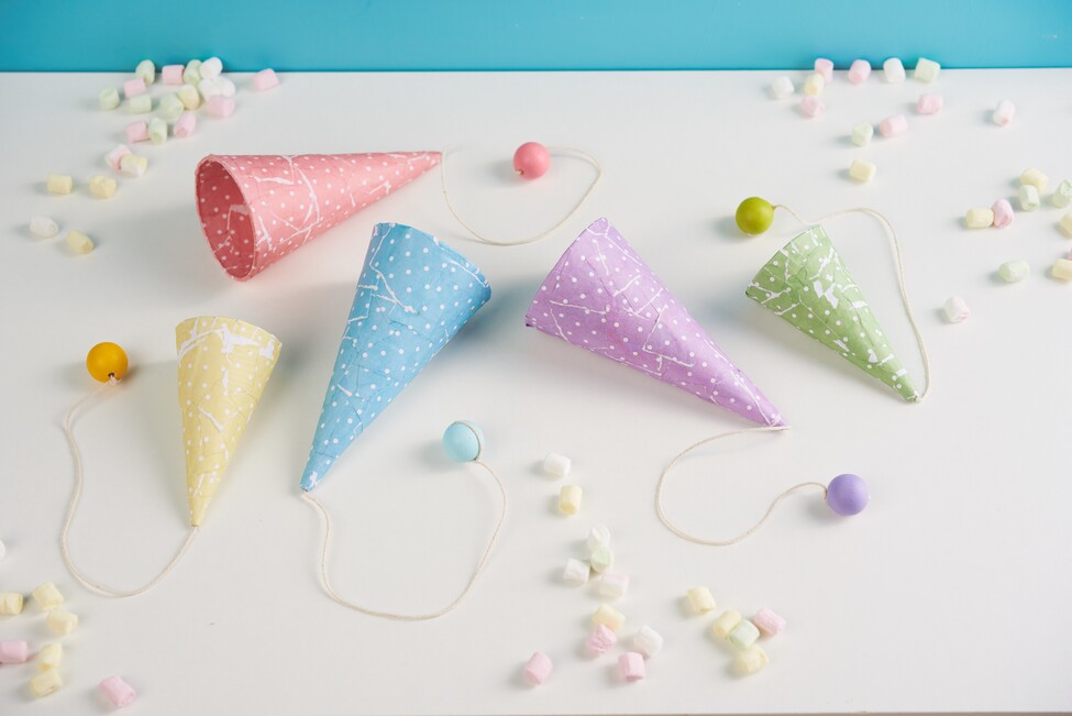 2. Then stick the small pieces of paper with the paste to the cardboard cone until you can no longer see it and leave it to dry until the paste is hard and completely dry.