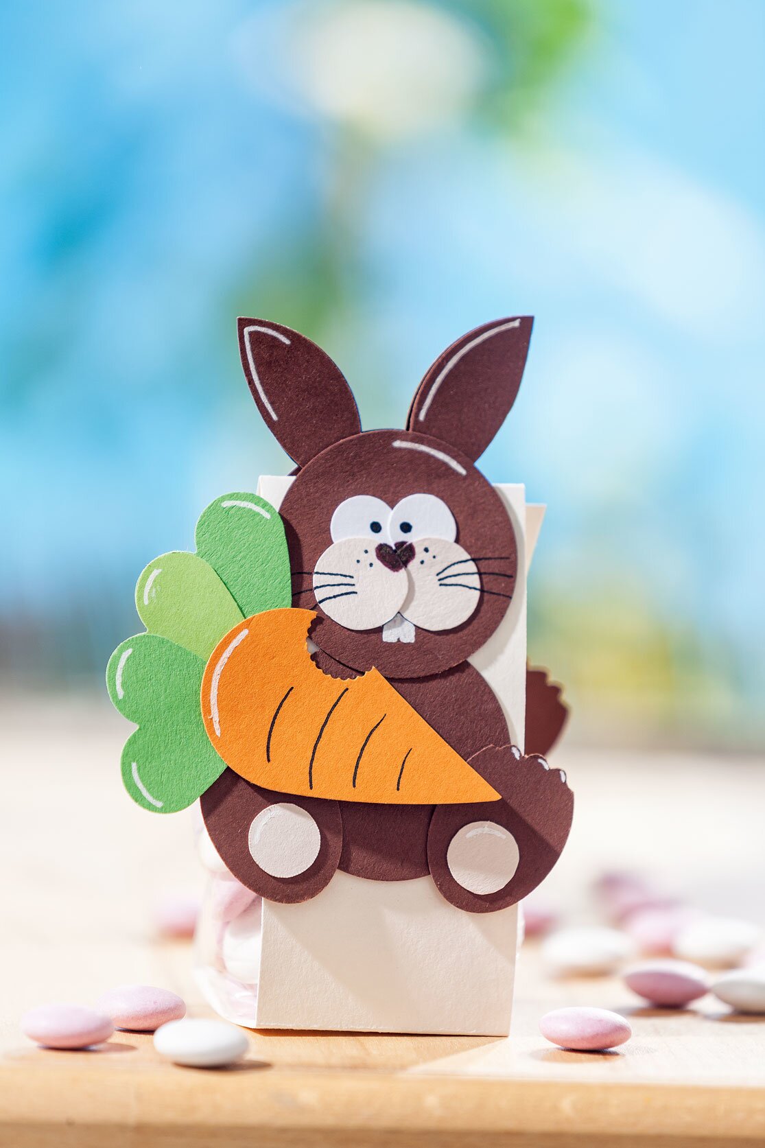 Cut a Paper strips of about 24 x 9 cm and fold it in the middle. This is then put over the cellophane bag and attached to the bag with an adhesive pad. Finally, simply fix the handmade rabbit on the Paper .