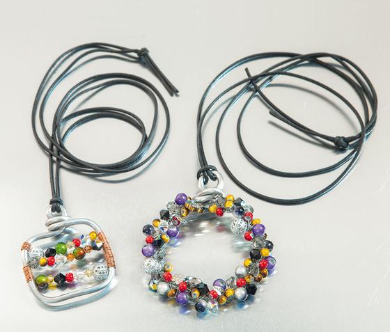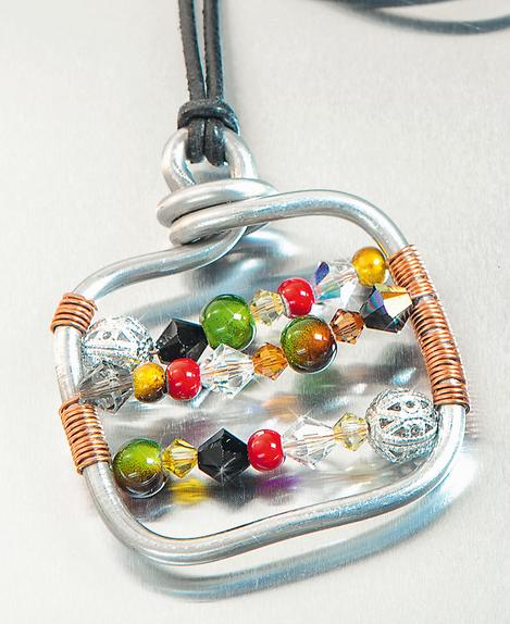 Make an eyelet from aluminium wire with the round nose pliers, then bend it into a circle or rectangle. These are the basic shape of the pendant.