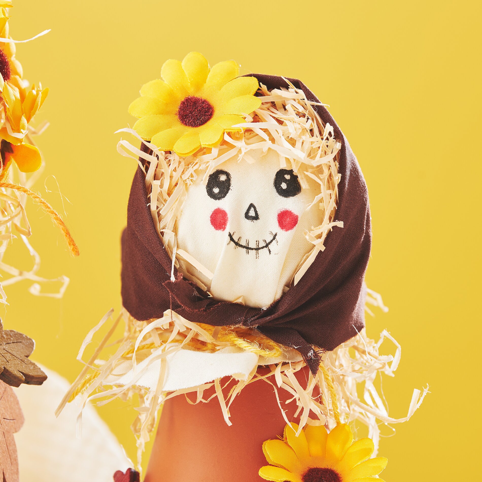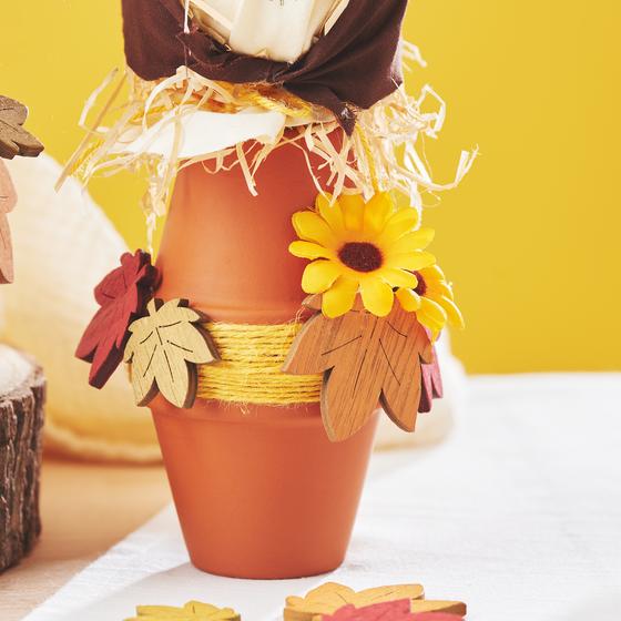 Wrap jute ribbon around the gluing point where the two clay pots are joined for a rustic look. Attach sunflowers and colorful scatter decoration to your scarecrow to give it a personal and colorful touch.