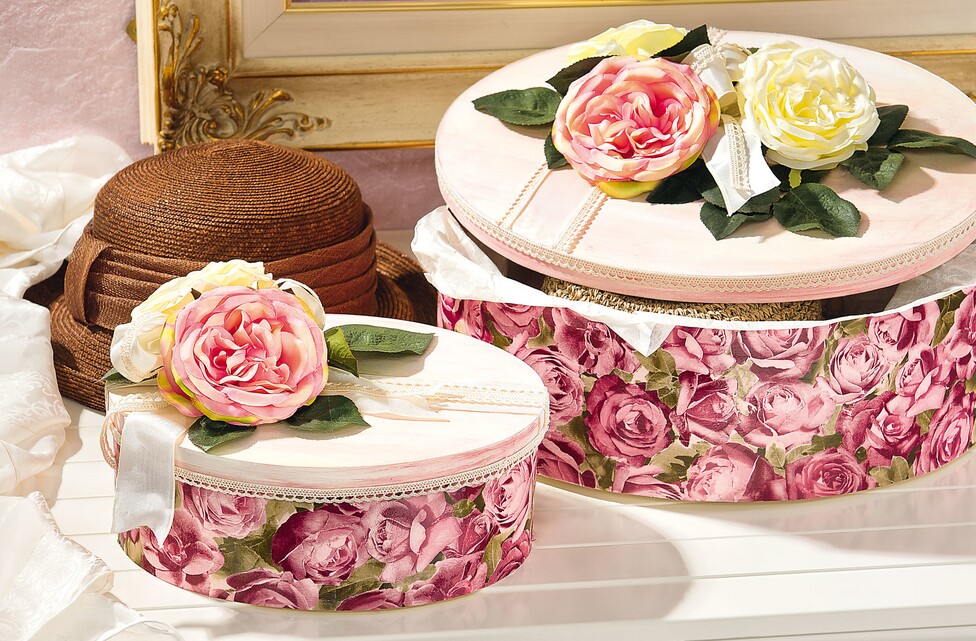 Décopatch in its most beautiful form - simply perfect for the design of these large chip boxes. The flat glued-on Paper lid is particularly effective due to its simple design. The sumptuous fabric roses are the highlight.